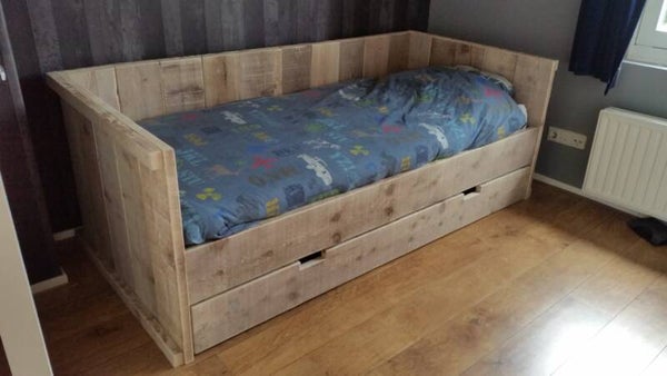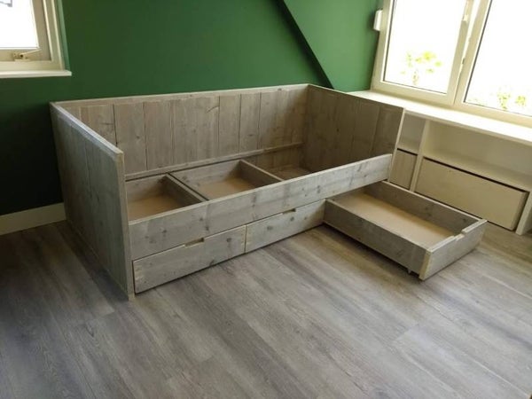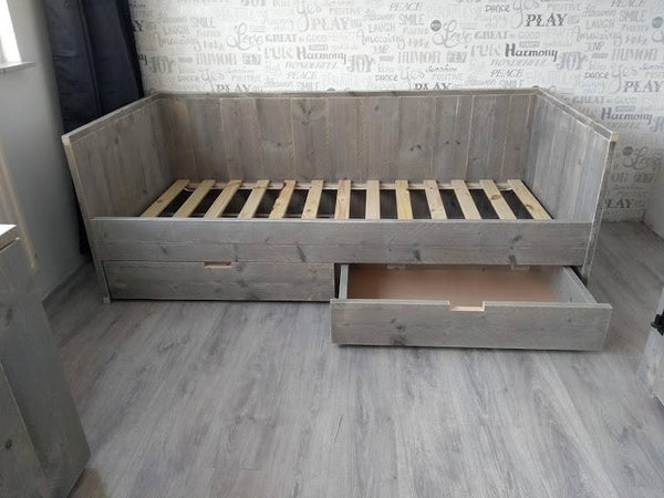 Deze bedbank kan zonder lade geleverd worden maar ook met 1 grote (logeer)lade, met 2 aparte lades of zelfs 3 lades.
