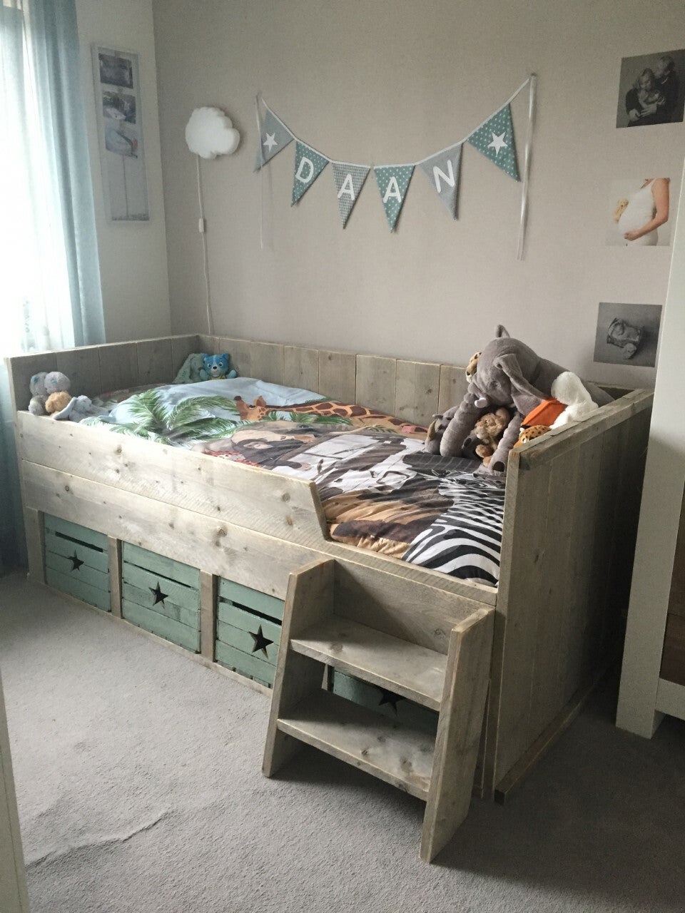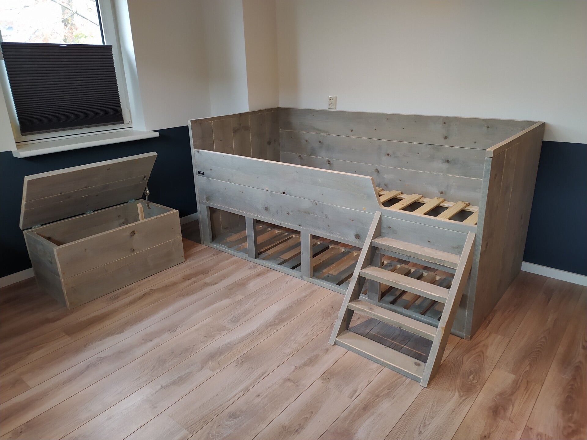 Bedbank met trapje. Trapje kan zowel links als rechts gemonteerd worden. Eventueel met hartje of sterretje.